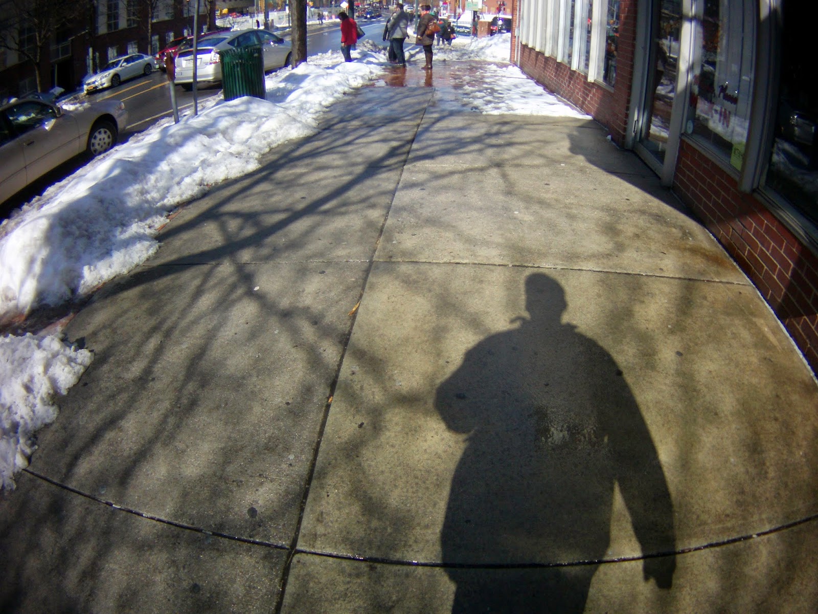 After a few days of frigid and icy weather, we were eager to get out into the sun and warmth today. These images are from our walk to Downtown Silver Spring. We went to Strosnider's Burgerfi, and Safeway. It wasn't easy, and I had wet feet when I got home, but we did it. It was better on the way back, as the melt is in full swing. Still, there are lots of places with plowed snow piles and puddles that are going to freeze into ice if not removed by Monday night.
